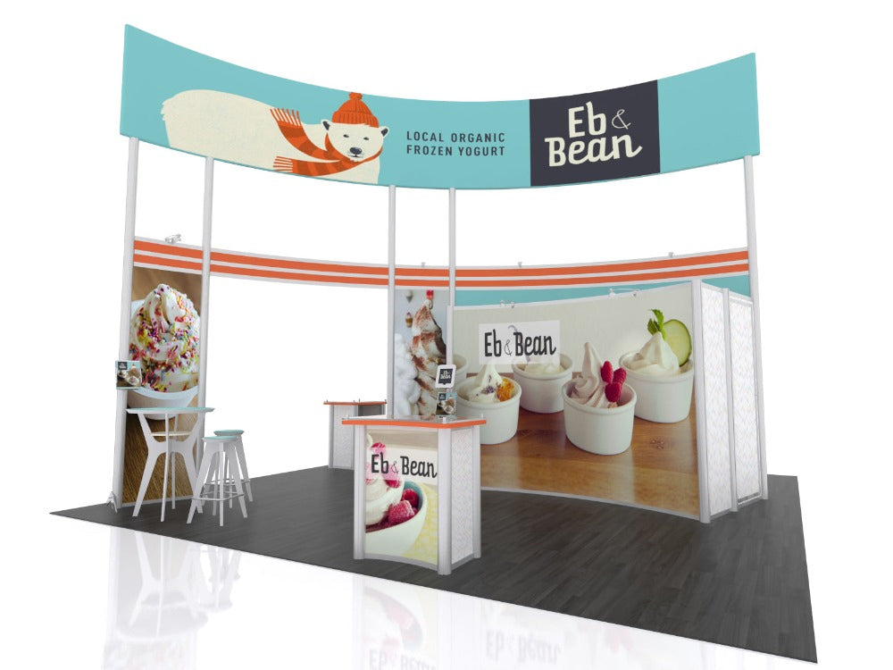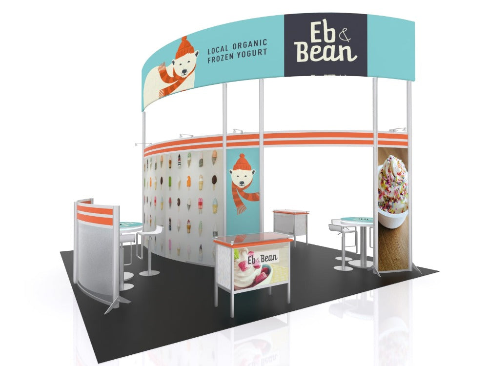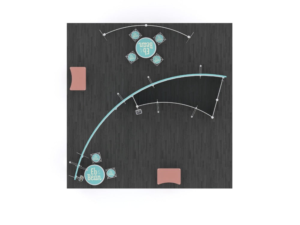 When it comes to island exhibits, sometimes a simple approach is better. The VK-5131 has a large 23 ft. long x 16 ft. high curved two-sided curved header for maximum visibility. The island design includes two modified MOD-1552 reception counters and MOD-1432 Bistro Charging Tables with Branding. In addition, there's a oversized closet with a full-size door for storage. All that would make for a pretty impressive island exhibit, except you need a place to sit down with your clients to negotiate that whopper multi-million dollar order.